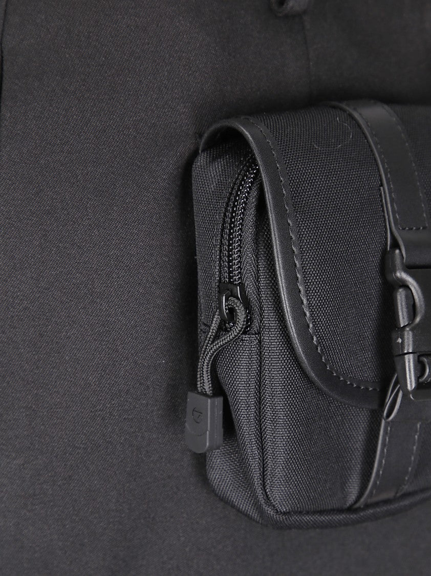 A structured mini skirt from Coperni embodies modern utility and style. It includes a front button and zip closure, complemented by two tone-on-tone pouch pockets with flap covers, buckle details, and zippers. The back showcases a sophisticated layered effect, while belt loops enhance the versatility of the silhouette, appealing to contemporary fashion enthusiasts.