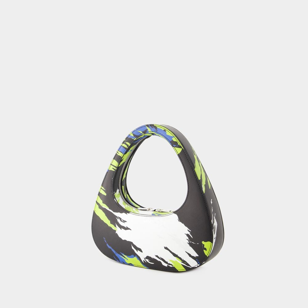 This sleek shoulder bag by Coperni showcases a unique curved silhouette crafted from smooth calfskin. The vibrant abstract patterns elevate its modern aesthetic, making it perfect for artistic outings and casual occasions.