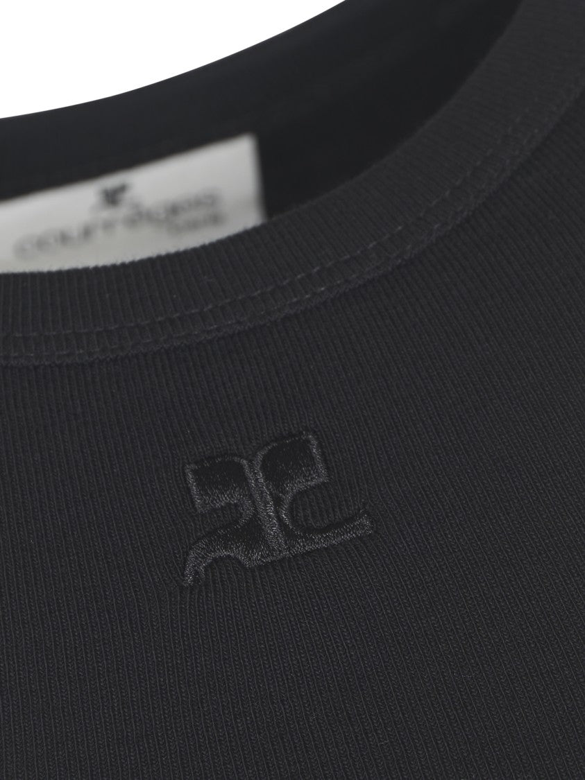 A standout piece from Courreges, this fitted sleeveless mini dress showcases a sleek silhouette that elegantly hugs the body. The round neckline and racerback design introduce a sporty flair, while the smooth 100% cotton fabric ensures optimum comfort and freedom of movement. This versatile dress seamlessly transitions from casual outings to stylish layering, embodying a contemporary aesthetic.