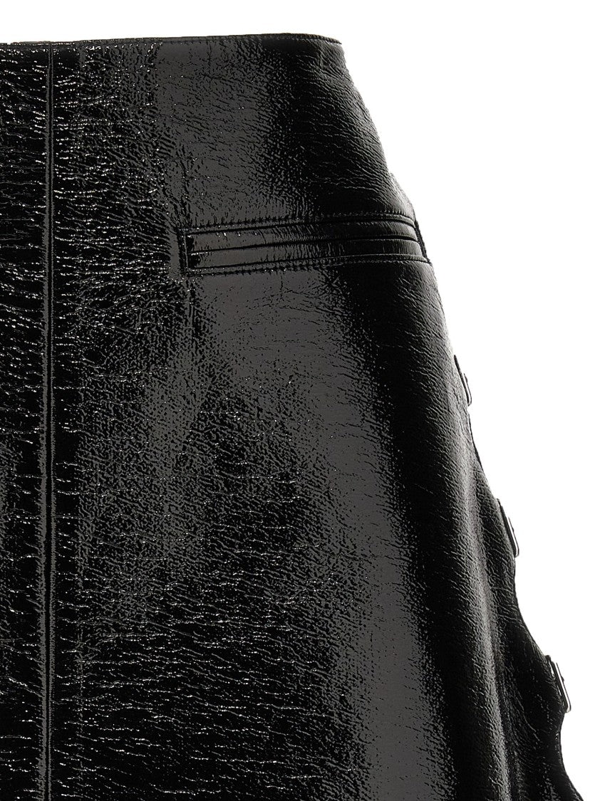 Renowned for its innovative approach to fashion, COURREGES presents a vinyl mini skirt that exemplifies modern edge. The flared silhouette and glossy finish create a contemporary aesthetic, enhanced by functional front pockets and adjustable buckle straps at the hips. This skirt is designed for a flattering fit, tailored to emphasize your shape while providing comfort.