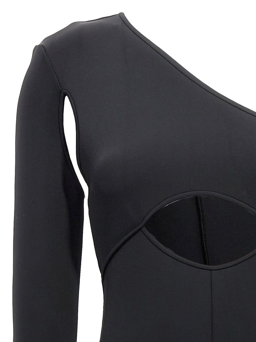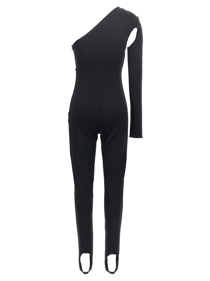 A one-shoulder bodysuit by David Koma, designed for the modern muse. Luxurious scuba stretch fabric enhances comfort and style, while the eye-catching front cut-out detail adds a unique touch. The sleek back zip closure ensures a secure fit, and the long legs end in foot bands for a polished look. This piece embodies sophistication and empowers confidence, making it perfect for any occasion.