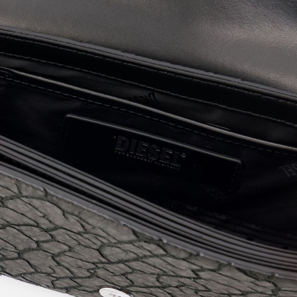 A hallmark of contemporary design, this shoulder bag from Diesel showcases a distinctive textured lambskin exterior with a unique cracked finish. The sleek silhouette is complemented by a single shoulder strap and a bold chain accent, enhancing its modern aesthetic. The spacious, lined interior provides ample room for essentials, making it an accessory for the fashionable individual.