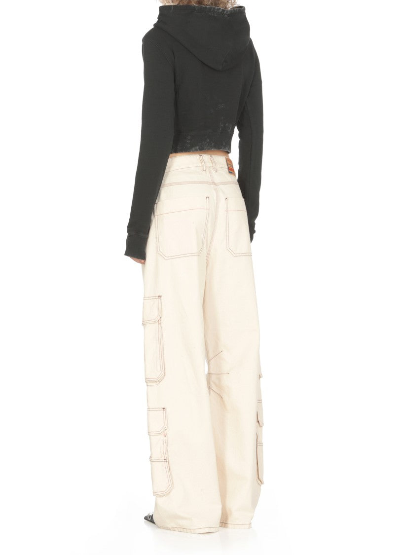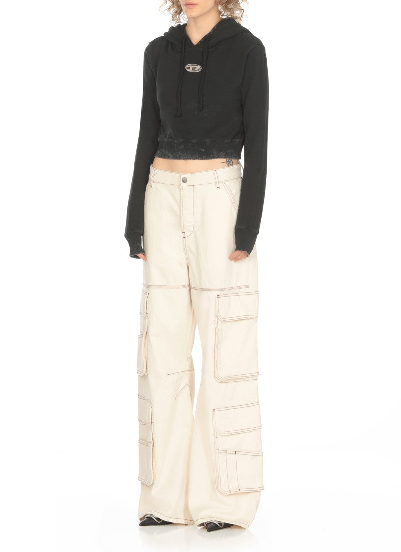 Elevate your casual wardrobe with this striking cropped hoodie by Diesel, made from premium cotton. Long sleeves and drawstrings provide a snug fit, enhanced by elastic ribbed trims. The hem features unique tie-dye details, while the front showcases a distinctive metal logo with cut-out accents, adding an edgy flair. This piece blends comfort and style, embodying modern streetwear.