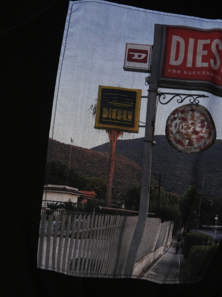 A long-sleeved t-shirt from Diesel with a bold black base and striking graphic prints on the front and back. The dynamic imagery adds a contemporary edge, making it perfect for expressing individuality in casual settings. Its relaxed fit ensures ultimate comfort, ideal for laid-back streetwear enthusiasts.