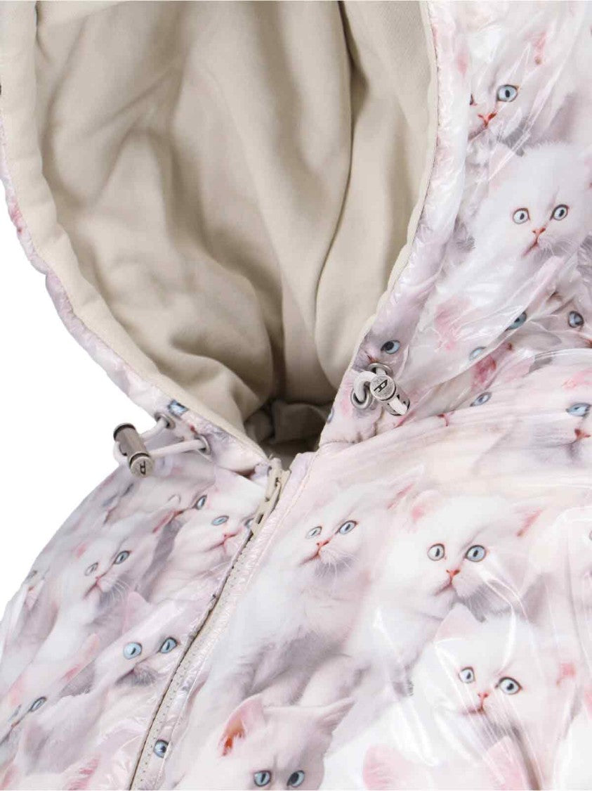A short puffer jacket by Diesel, showcasing a whimsical kitten print in vibrant multicolor fabric. This piece features an adjustable drawstring hood, a practical double zipper closure, and two side pockets for convenience. The bottom cinches with a drawstring for a personalized fit, while the straight hemline and subtly embroidered logo provide a touch of signature style.