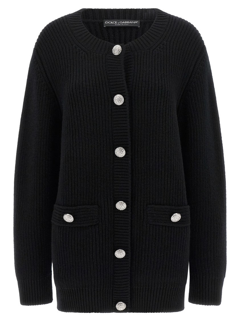 This knitted wool cardigan from Dolce & Gabbana showcases luxury through its round neckline and elegant front snap closure with jewel buttons. The relaxed fit includes long cuffed sleeves and two front pockets, merging practicality with refined aesthetics.