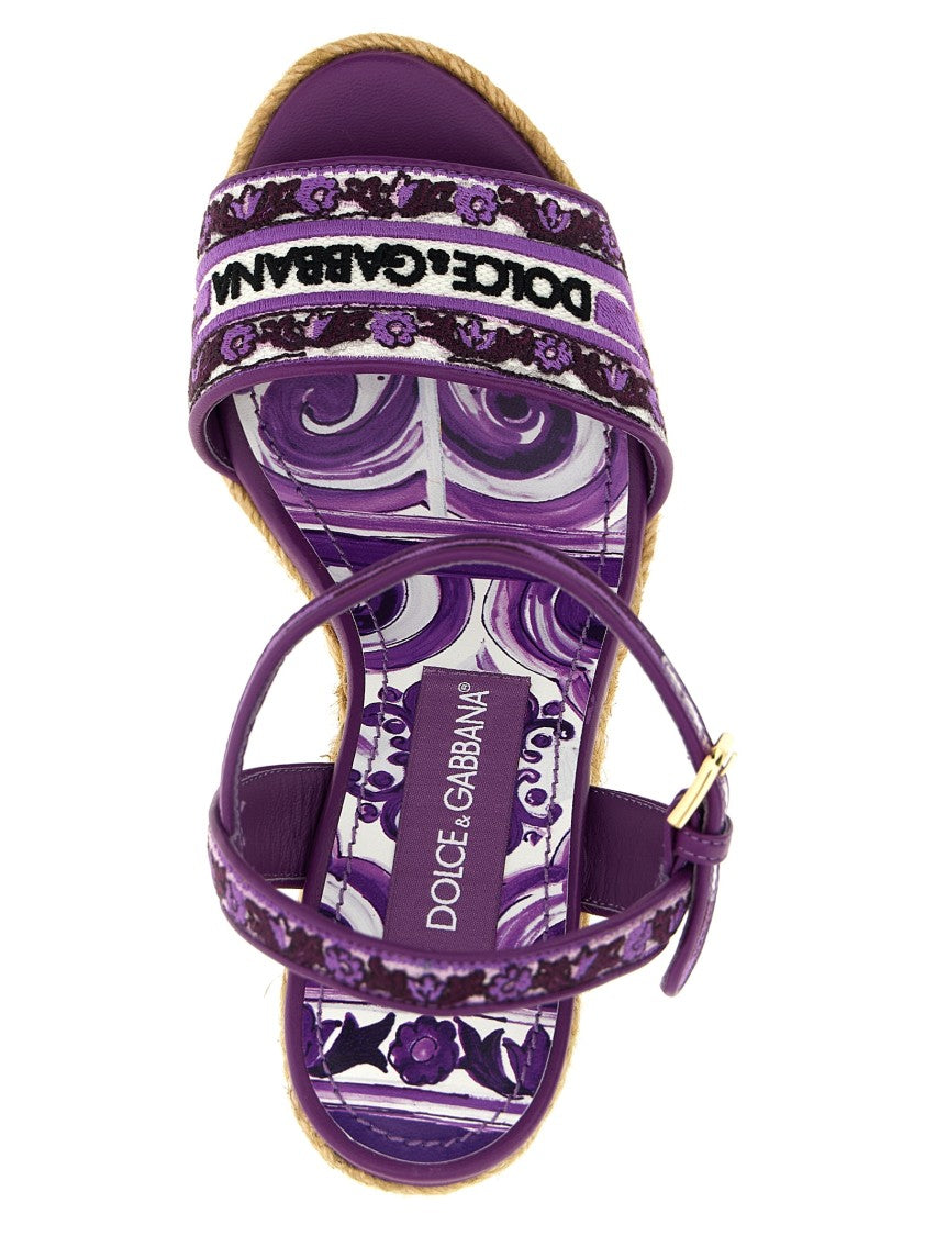 Indulge in the elegance of Dolce & Gabbana's thread-embroidered 'Maiolica' wedge sandals. Crafted with a luxurious nappa upper and adorned with a striking purple 'Maiolica' pattern, these sandals feature an adjustable strap for a perfect fit. The 9 cm wedge heel is beautifully wrapped in natural rope, while the combination of TPU and leather sole offers both durability and comfort, making them ideal for chic casual outings or refined occasions.