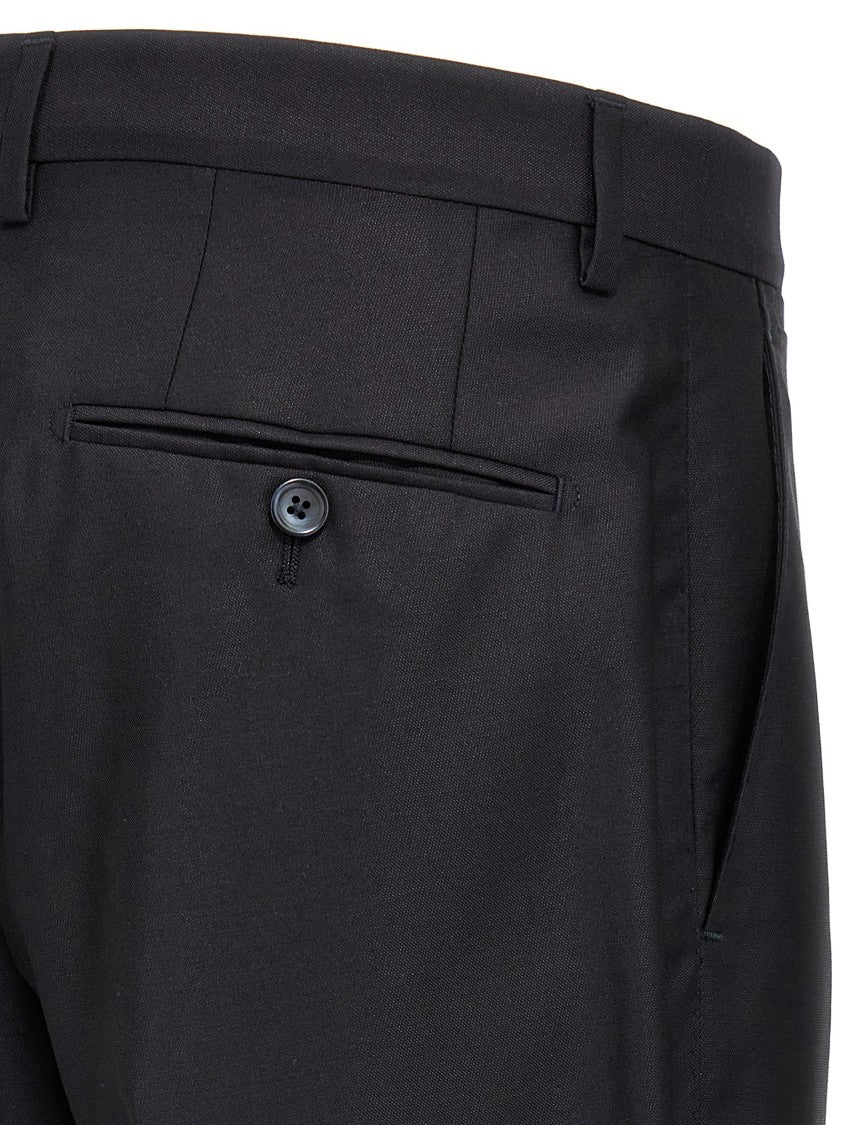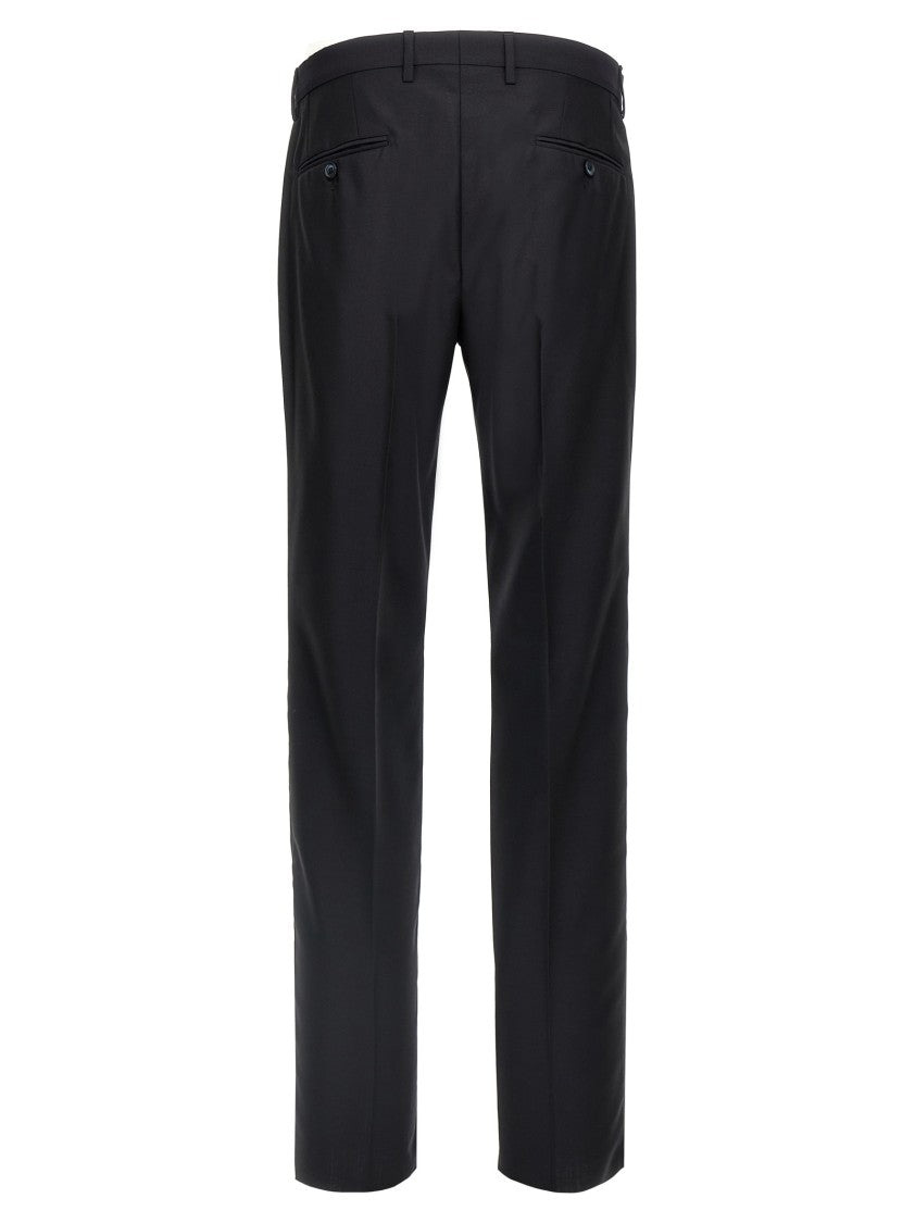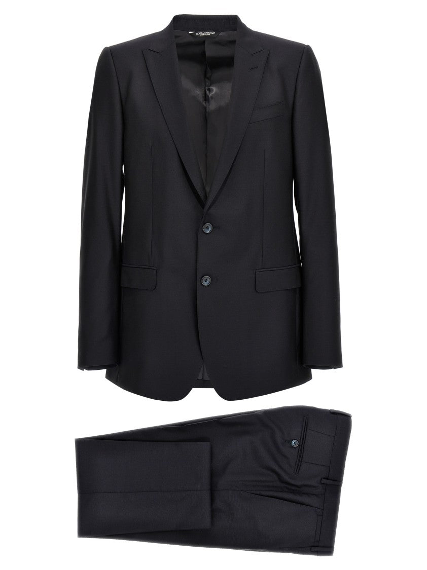 The Dolce & Gabbana single-breasted 'Martini' ensemble is a sophisticated jacket dress made from a luxurious blend of virgin wool and silk. It features peak lapels, long sleeves with padded shoulders, and a chic back central split. The fitted straight trousers provide a tailored silhouette, equipped with zip, button, and hook closure, along with functional pockets for added convenience.