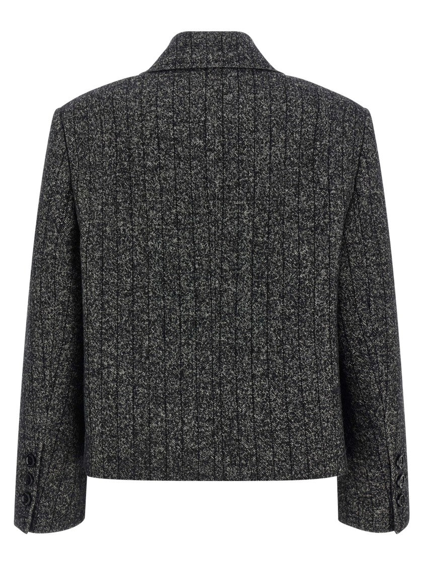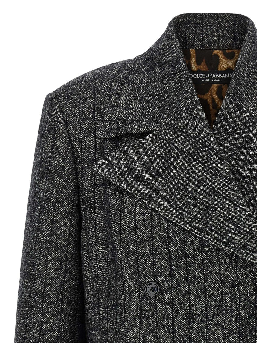 The epitome of sophistication, this oversized wool blazer by Dolce & Gabbana seamlessly blends classic design with a contemporary twist. Showcasing a striking striped pattern, it features a double-breasted front with a chic button closure, a maxi collar, and lustrous mirror lapels. The luxurious interior is adorned with an eye-catching animal print fabric, adding a unique flair. Functional flap pockets, structured shoulder straps, and long sleeves complete this statement piece, perfect for the modern woman who values style and elegance.
