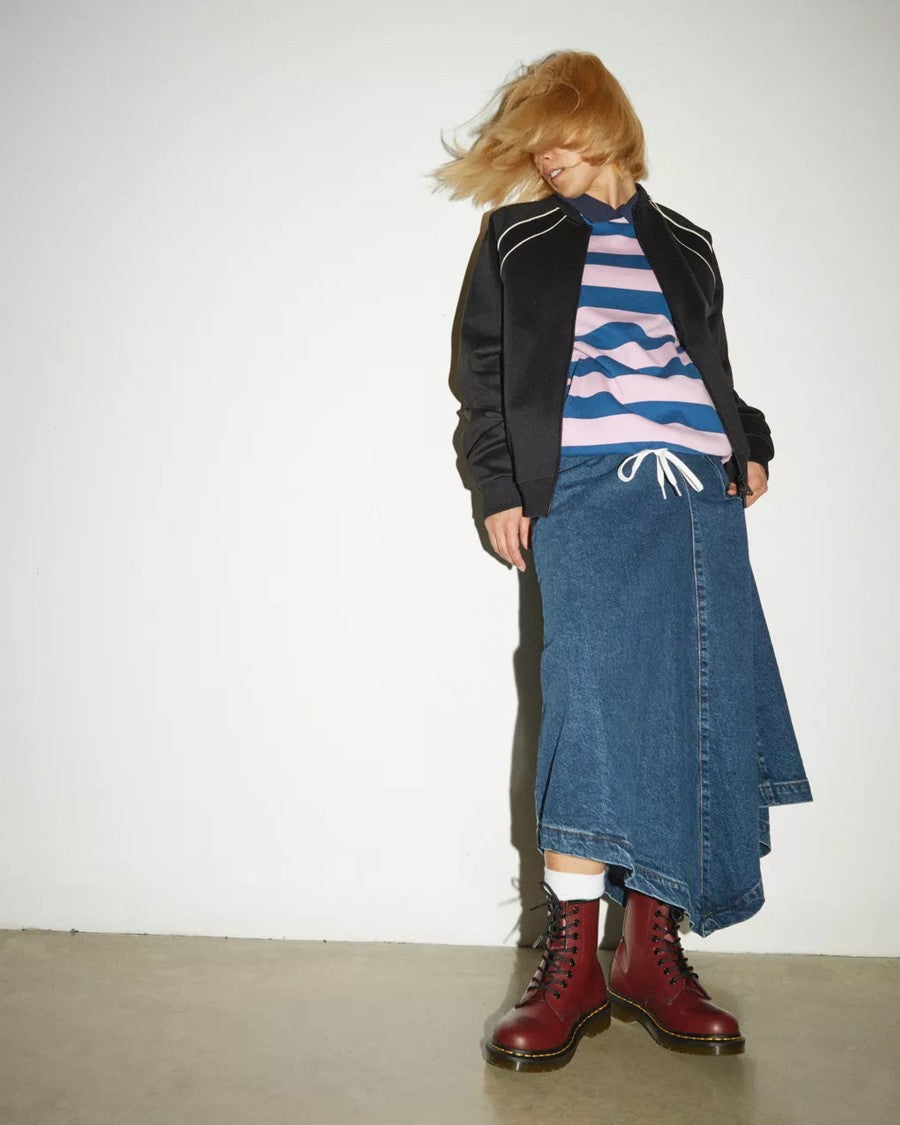 Dr. Martens offers smooth red lace-up boots made from high-quality leather. Iconic design elements include grooved sides, a heel loop, and yellow stitching. Comfort is prioritized with cushioned air soles for support and a translucent rubber sole for grip and durability.