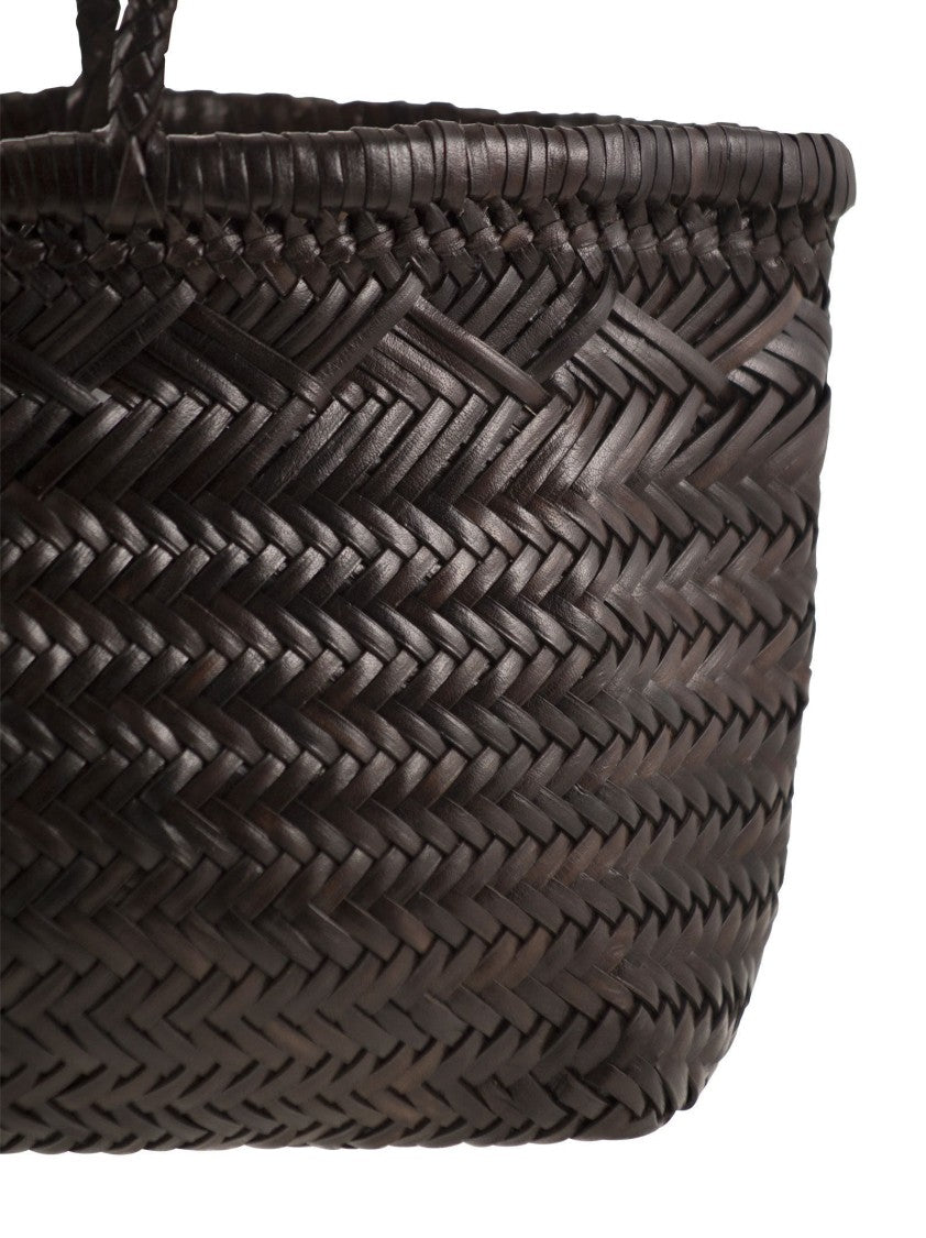 Dragon Diffusion introduces a hand-woven basket bag made from smooth buffalo calfskin, showcasing a unique diagonal chevron design. The spacious bag has an unlined interior and an open top, reflecting traditional artisan techniques. Two sturdy handles ensure effortless carrying, making it an ideal accessory for casual and bohemian styles.