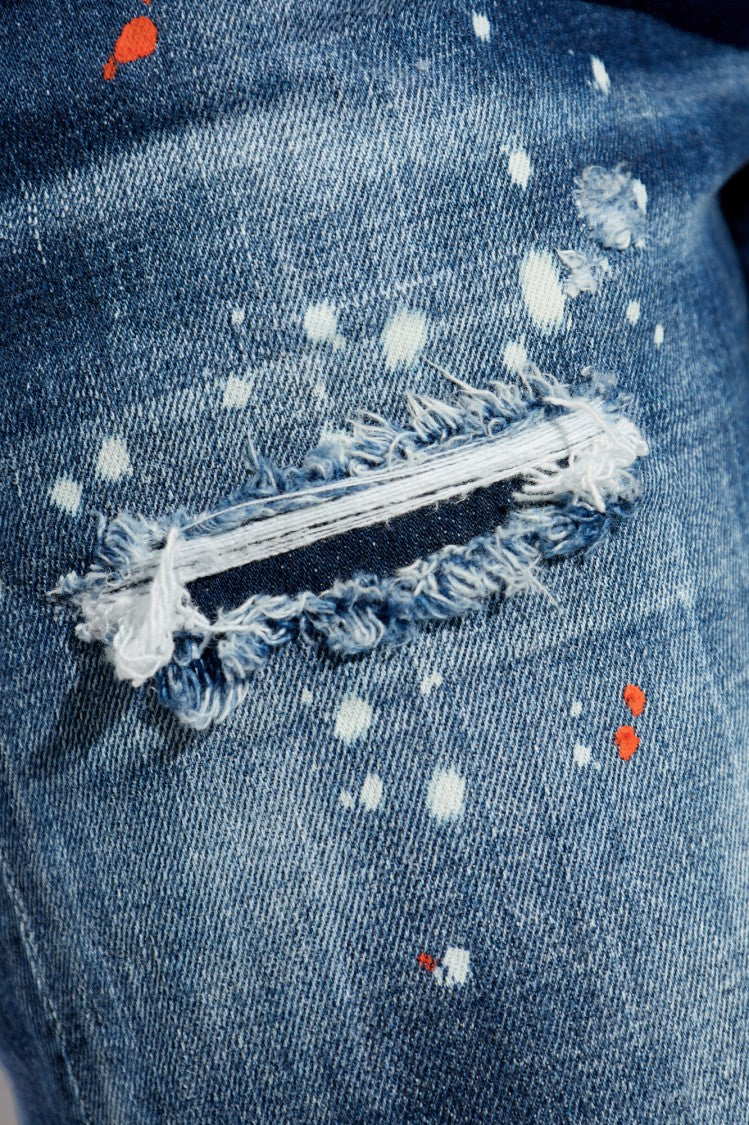 Medium Waist Jennifer Jeans From The Acclaimed Dsquared2 Collection Represent The Height Of Contemporary Style And Refinement. Crafted From Premium Denim, These Navy Blue Trousers Feature A Distinctive Washed Effect, Accented By Trendy Abrasions And Tears That Lend A Unique Character To Each Piece. The Standout Pattern Of White And Orange Spots Ensures Each Pair Is One-Of-A-Kind, While The Skinny Fit Silhouette Beautifully Complements The Body, Enhancing Its Natural Allure. Finished With A Leather Patch Showcasing The Designer’S Logo And Chic Silver Fastening Details, These Jeans Are A Statement In Urban Luxury.
