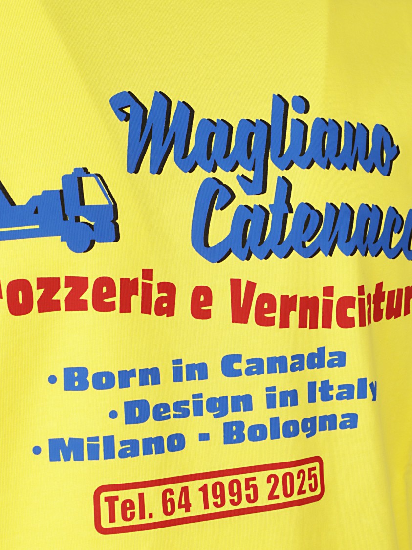A striking yellow t-shirt from DSQUARED X MAGLIANO features a vibrant graphic with bold blue and red text and a whimsical truck illustration on the front. Tailored for a relaxed fit, it includes a classic crew neckline for comfort and style.