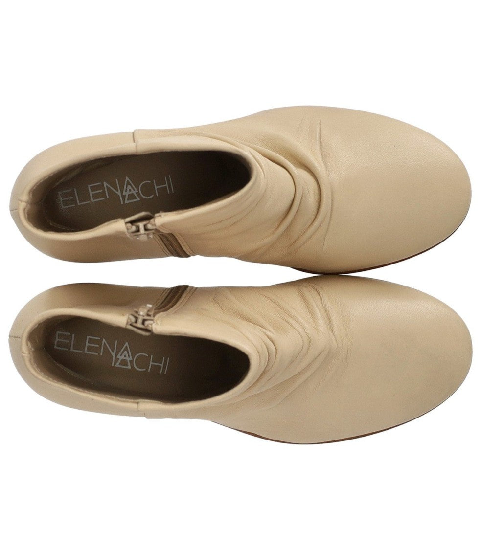 Elena Iachi introduces the Charme ankle boot, a stylish addition made from high-quality ecru leather. Featuring a round toe and a subtle side zip closure, this boot exudes sophistication. The gathered leather creates a unique silhouette, complemented by a leather lining and matching logo insole for comfort. The modern cylindrical heel, measuring 7 cm, adds a contemporary touch to any outfit.