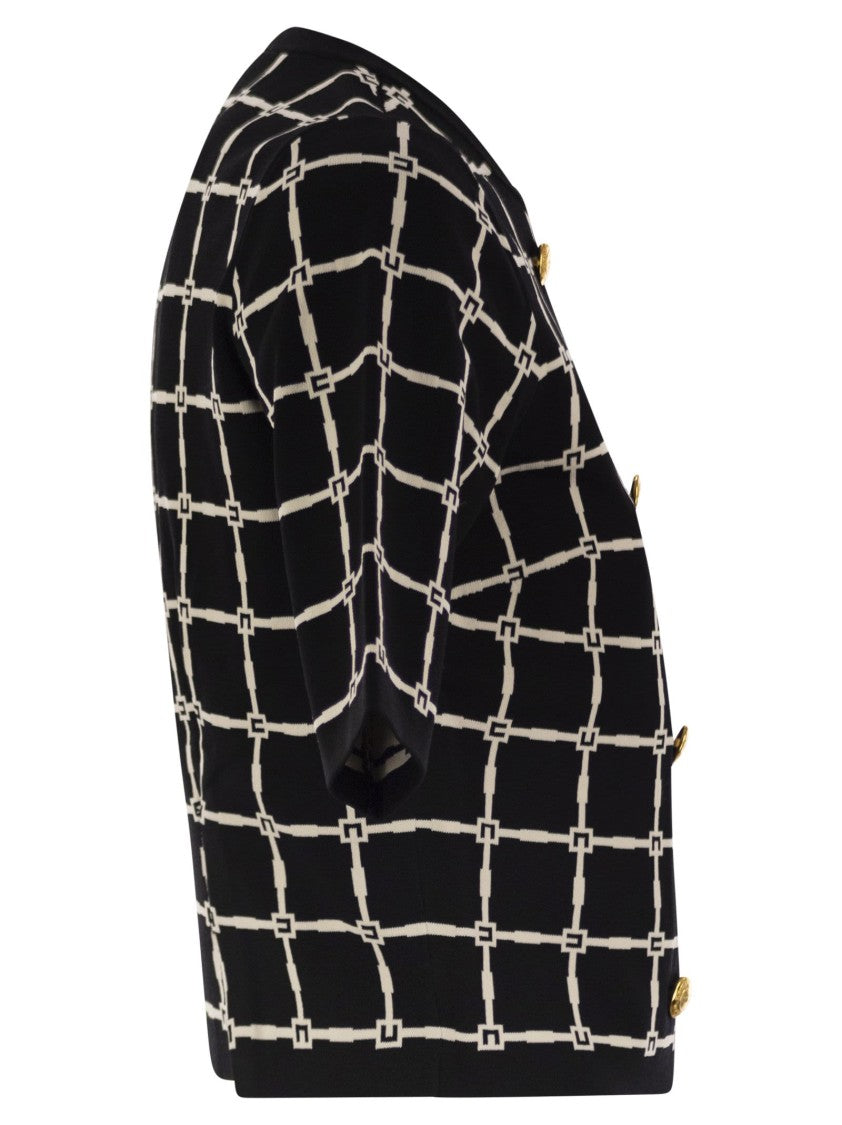 Sophisticated black jacquard cardigan by Elisabetta Franchi features a stylish crew neck and graceful ¾ sleeves. The double-breasted closure showcases a prominent logo motif, enhanced by gold metal buttons that exude elegance. Designed for a regular fit, it offers comfort without compromising on style.