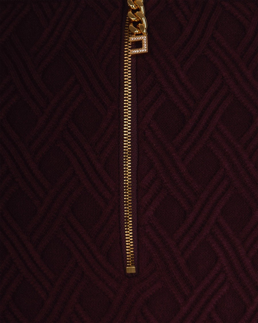 A fitted tube skirt features a high waist and an all-over 3D diamond knit texture. A luxurious gold-tone chain with a logo and rhinestone embellishments adds glamour to any wardrobe. The back includes a visible gold zipper with a chain pull for added sophistication.
