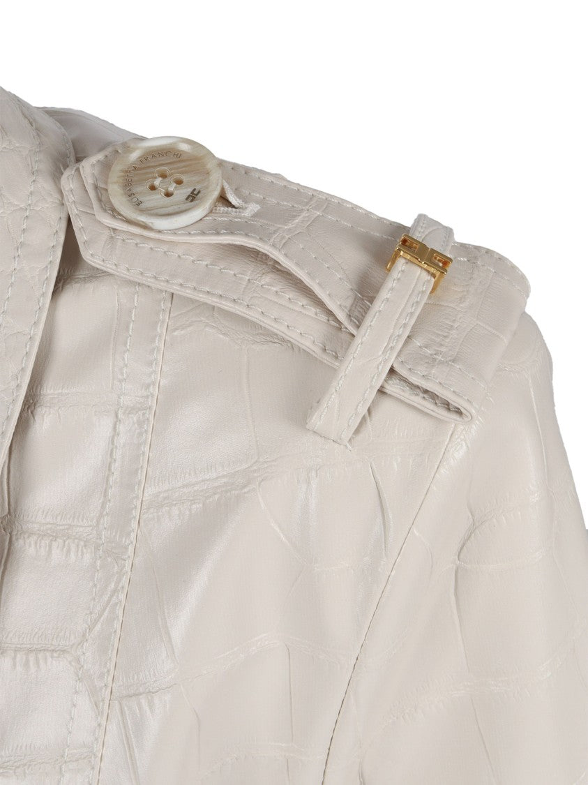 Elisabetta Franchi offers a refined long coat that captures a timeless minimalist aesthetic. It has a smooth, slightly shiny finish and a tailored silhouette, complemented by a classic collar and elegant button closure. The clean lines enhance its polished appeal, making it a versatile essential for sophisticated wardrobes.