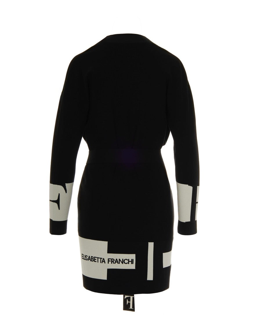 A stunning knee-length cardigan crafted from a premium viscose blend, characterized by a relaxed fit and modern design. The sleek black base is enhanced by bold glossy white block accents on the sleeves and hem, creating a striking contrast. The tie belt at the waist, finished with the brand's logo, adds an elegant touch, making this piece a perfect statement for any refined wardrobe.