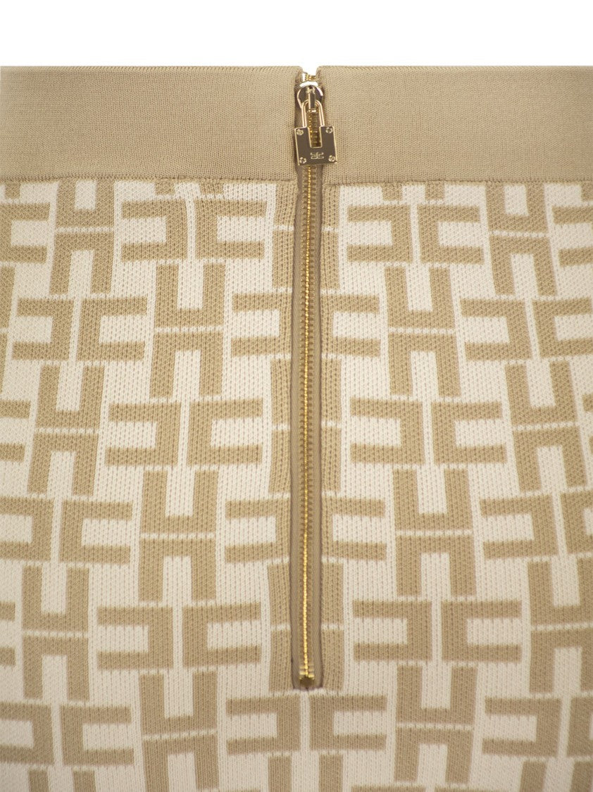 Elisabetta Franchi presents a captivating miniskirt crafted from luxurious jacquard viscose, adorned with an all-over double C logo motif. This stunning piece showcases a regular waist design and is accentuated by a contrasting band. A sophisticated gold metal back zip completes this elegant silhouette, making it a perfect choice for versatile styling.