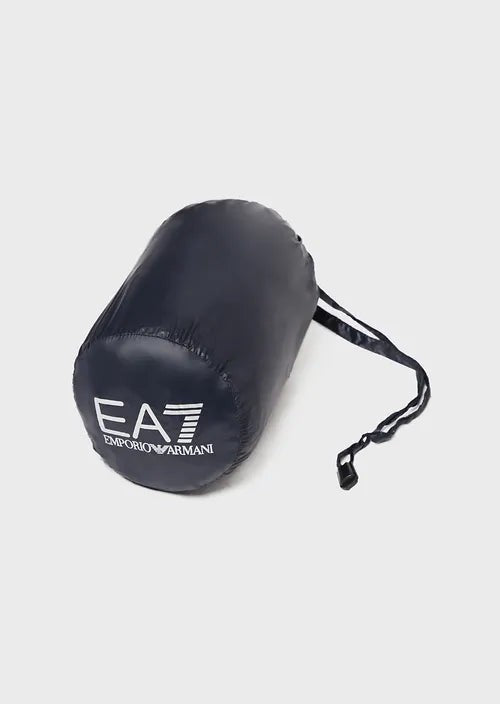 Navy down waistcoat by EA7 Emporio Armani combines warmth and style with a sleek quilted design. It includes a high collar, front zip closure, and convenient side zip pockets, making it ideal for outdoor activities or casual outings.