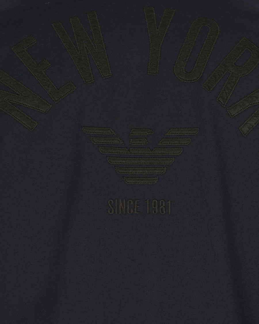 This Emporio Armani padded jacket blends polyester and viscose for a modern aesthetic. It includes a classic polo collar, contrasting metal buttons, a noticeable logo on the back, and elasticized cuffs, ideal for a fashionable casual look.