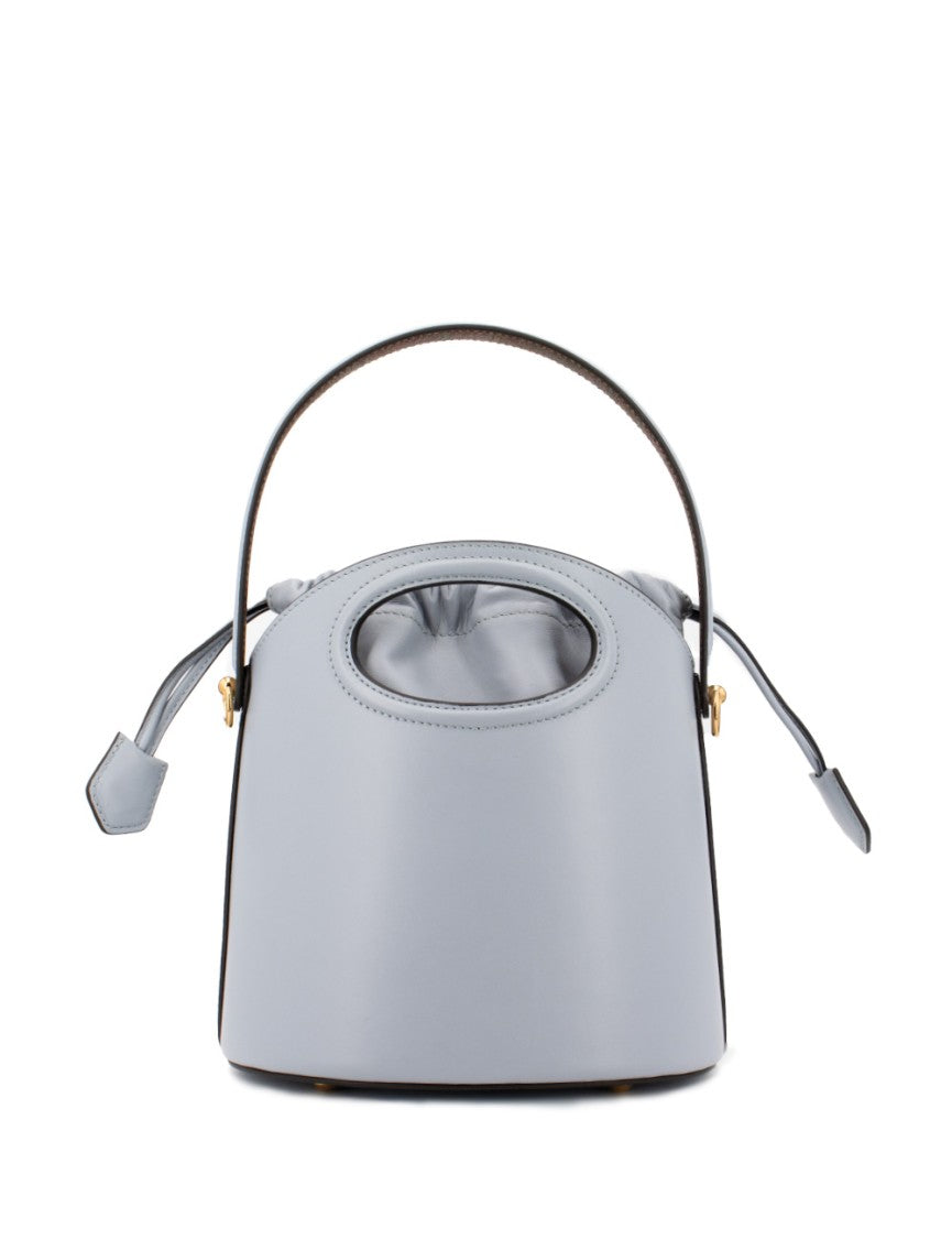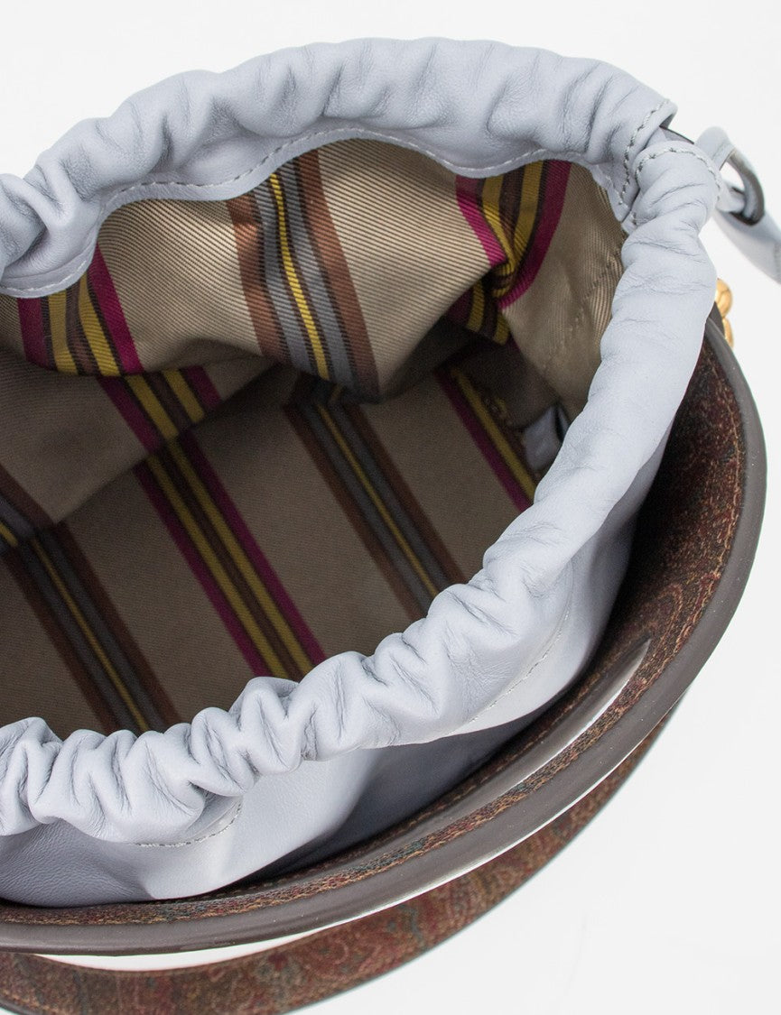 Sophisticated craftsmanship defines this blue bag, showcasing intricate paisley jacquard details. Made from genuine leather, it features a structured silhouette with a soft, gathered top and a smooth exterior that has a subtle sheen. The spacious interior is lined with striped fabric, offering versatility as it can be carried by the oval handle or worn as a shoulder bag, making it an essential accessory for any occasion.