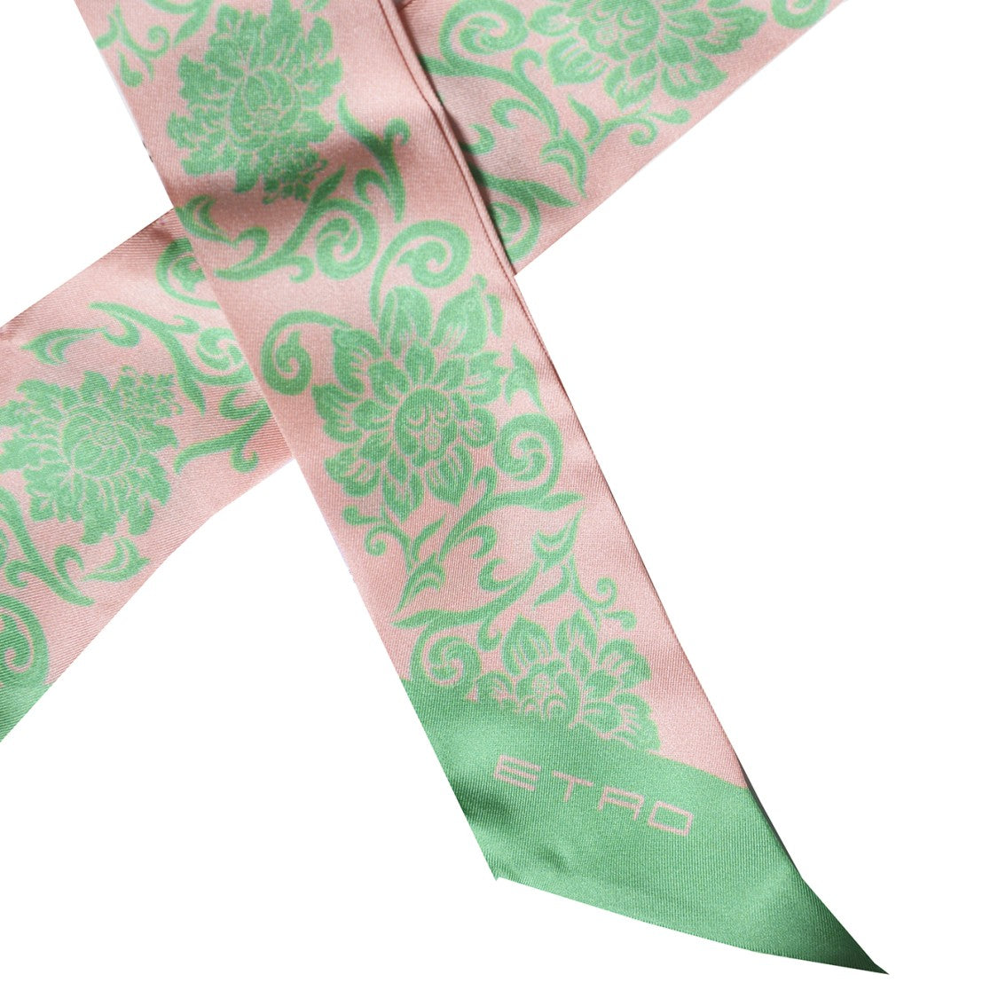 Experience the luxurious charm of this silk twill scarf by Etro, adorned with a stunning floral Paisley design in gentle pink and green hues. Contrasting solid-color shorter edges enhance its appeal, while the logo print introduces a refined branding element. This scarf is an ideal accessory to enhance any ensemble.