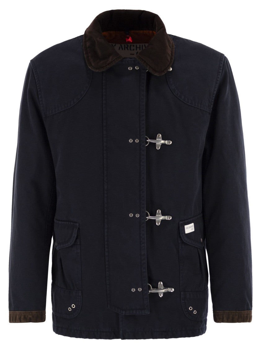 The 4 Ganci jacket embodies a blend of tradition and modernity, drawing inspiration from American firefighter uniforms. Crafted from luxurious cotton, it boasts a quilted, padded interior with an onion-patterned lining. The jacket is highlighted by a prominent metal hook closure and velvet accents, along with large flap pockets secured by press studs and an internal pocket. A comfort-fit silhouette allows for easy movement, while the Fay Archive label on the left pocket emphasizes its fashion significance.