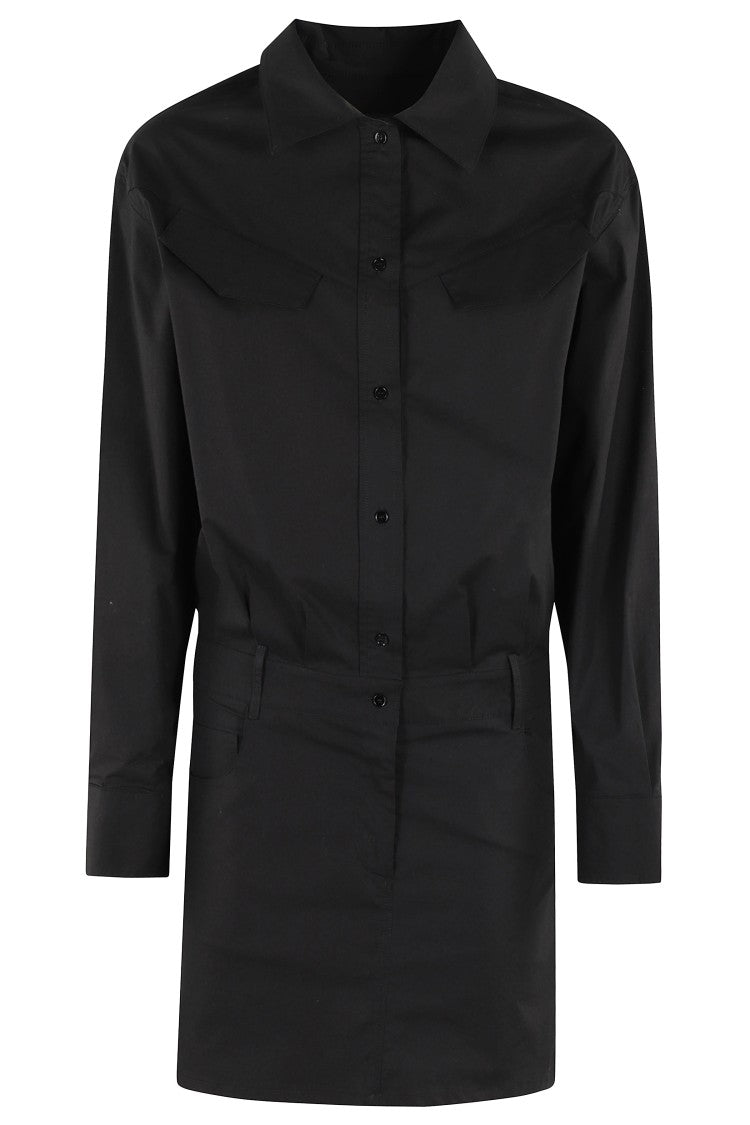 This sporty black dress by Federica Tosi is made from a durable cotton blend. It showcases a classic shirt collar, long sleeves with buttoned cuffs, and a convenient front button closure. The design includes belt loops at the waist and side pockets, blending functionality with a regular fit, perfect for casual outings.