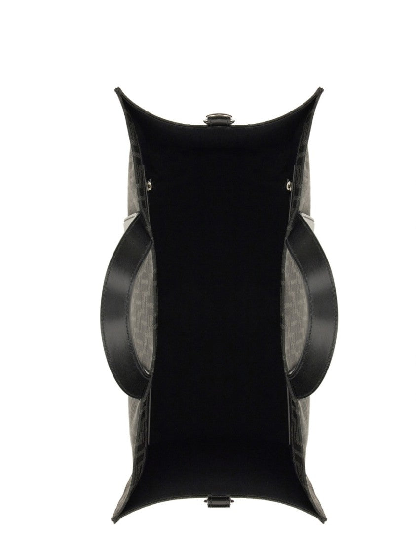 Fendi introduces a structured rectangular tote bag that showcases a sophisticated monogram pattern, highlighting its distinguished heritage. This tote is made from a premium blend of materials and features two robust top handles along with elegant vertical strips for added style. Its spacious interior offers practical versatility, complemented by a detachable shoulder strap for easy carrying.