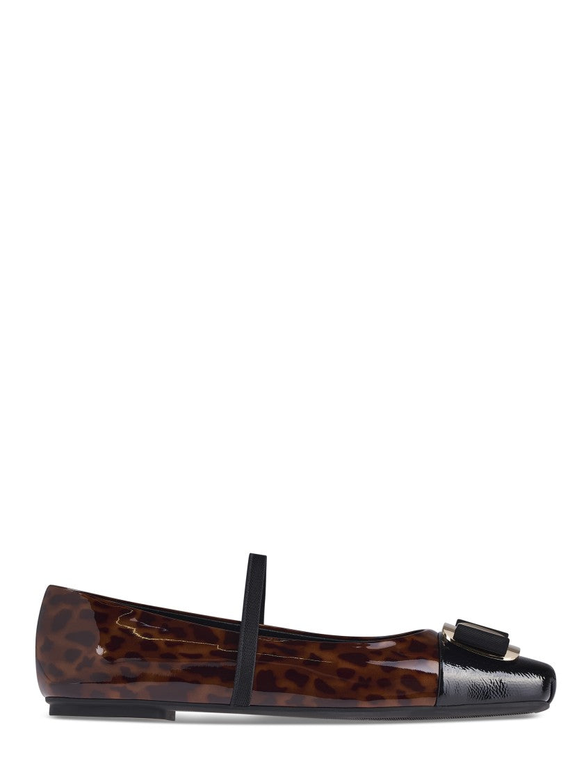 These flat shoes from Ferragamo showcase a glossy patent finish paired with a chic leopard print upper. The black toe cap and decorative bow detail add to their sophisticated look. Designed for comfort, they include a subtle strap for added security, making them both elegant and versatile.