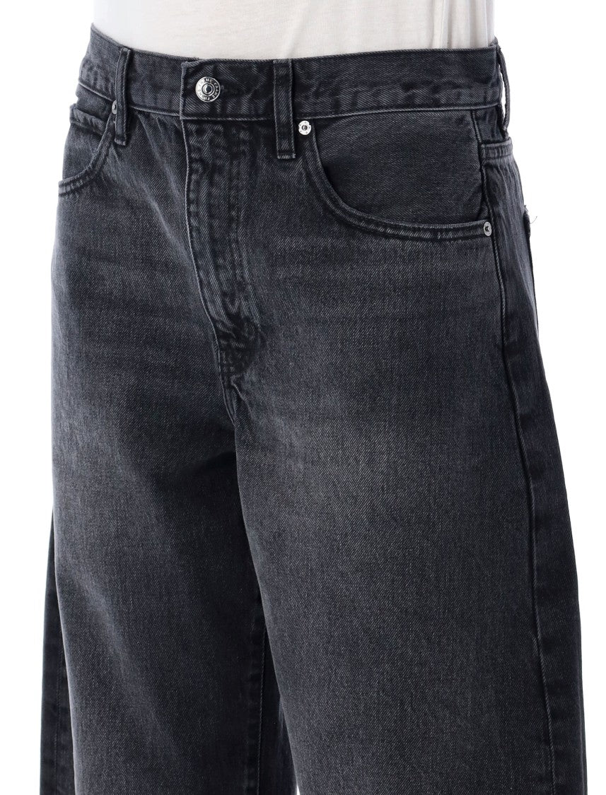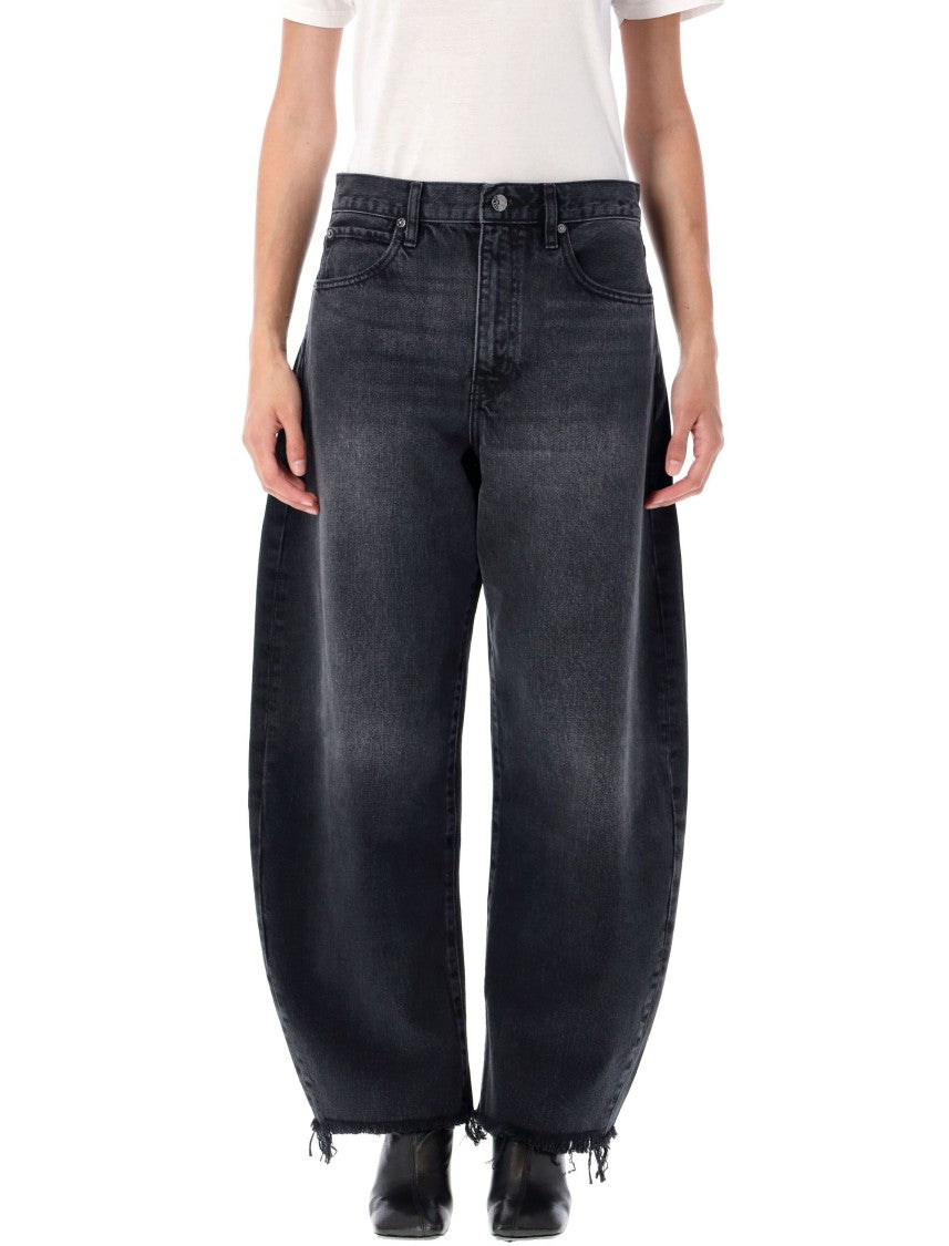 Frame introduces a cutting-edge style with these high-waisted wide-leg cropped jeans. They feature a voluminous bubble silhouette and traditional five-pocket design. The frayed hem adds an edgy touch to the dark wash denim, making these jeans a chic choice for city living.