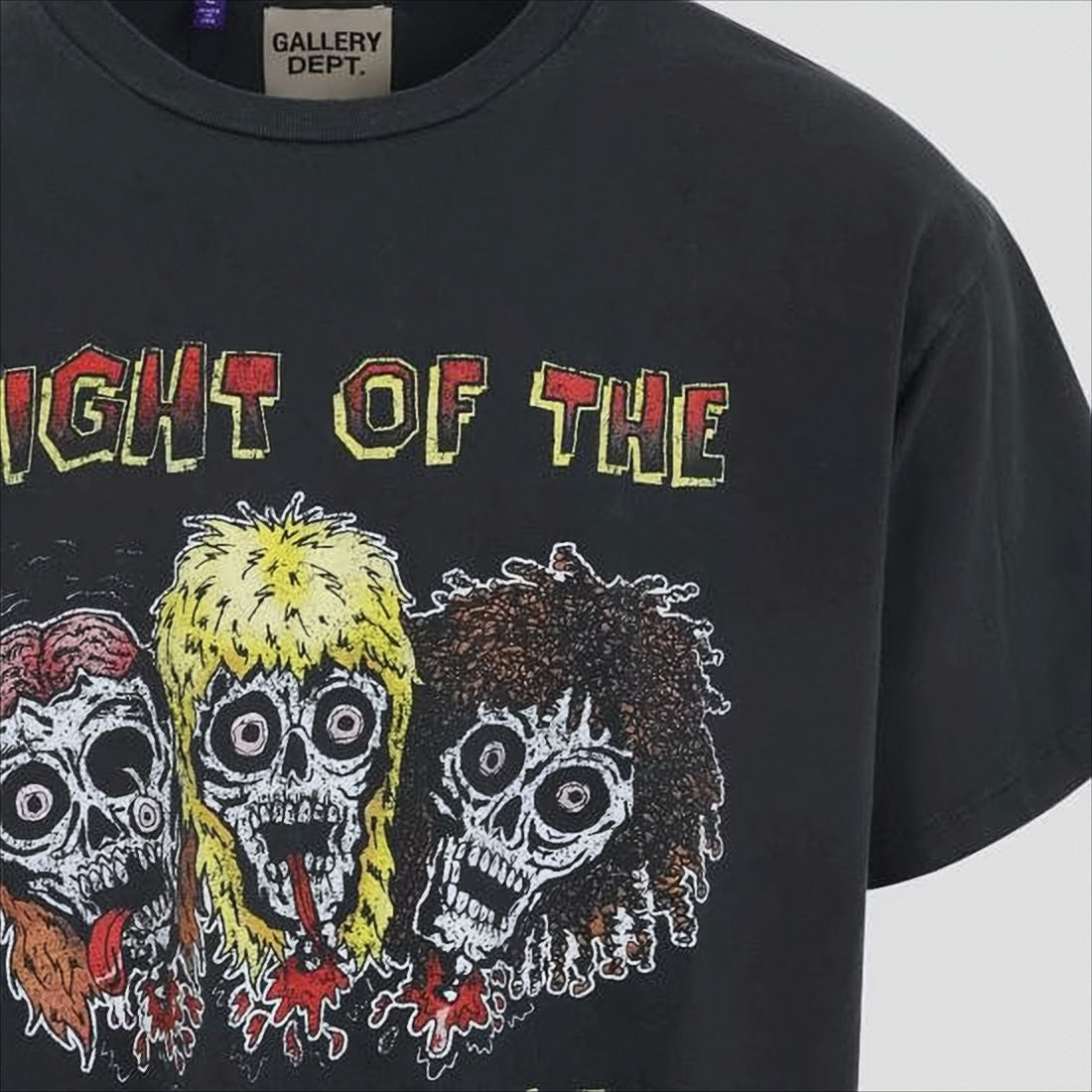 This striking short-sleeve t-shirt from Gallery Dept. showcases a dark base adorned with a dynamic graphic print featuring three stylized skull faces, each with vibrant hair, alongside the text 'NIGHT OF THE LIVING DEAD.' The reverse highlights a bold logo, complemented by a classic crew neckline and a relaxed fit for effortless style.