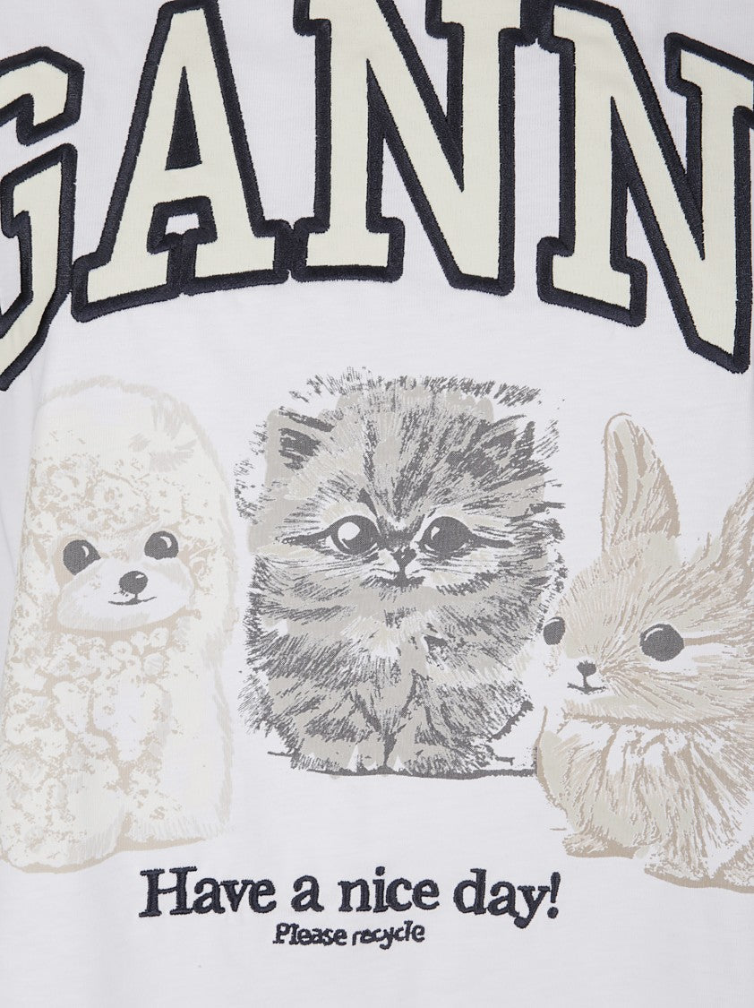 Ganni introduces a relaxed-fit crew neck T-shirt, an essential addition to modern wardrobes. Made from organic cotton, this piece features whimsical animal illustrations alongside vibrant lettering that delivers an uplifting message. Its short sleeves and easygoing shape are ideal for casual outings, reflecting a playful and creative vibe.