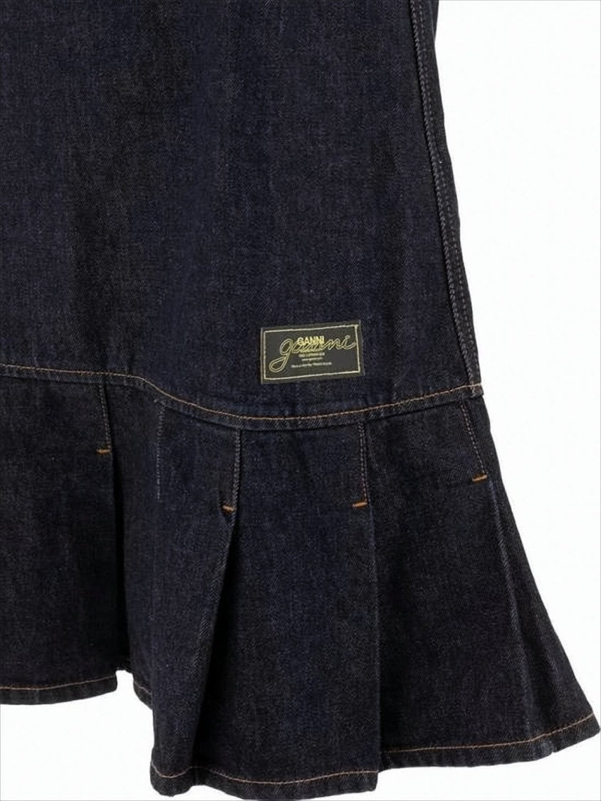 Ganni offers a sophisticated short dress made from organic cotton denim. Thin shoulder straps and a straight neckline enhance the design, which flares out at the hem with a distinctive pleated ruffle detail. Eye-catching contrast stitching and a subtle label near the hem provide unique touches, making it a versatile addition to any wardrobe. Ideal for casual luxury, this dress is perfect for effortless styling on sunny days.