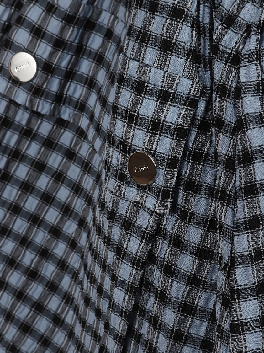 Ganni'S Captivating Dress Embodies A Playful Spirit Through Its Smocked Bodice And High Neckline, Complemented By Short Puff Sleeves. The Voluminous, Flared Skirt Enhances The Silhouette, While A Classic Check Pattern In Contrasting Tones And Side Button Details Add Visual Interest. Crafted From A Blend Of Organic Cotton And Recycled Polyester, This Piece Is A Testament To Sustainable Luxury.