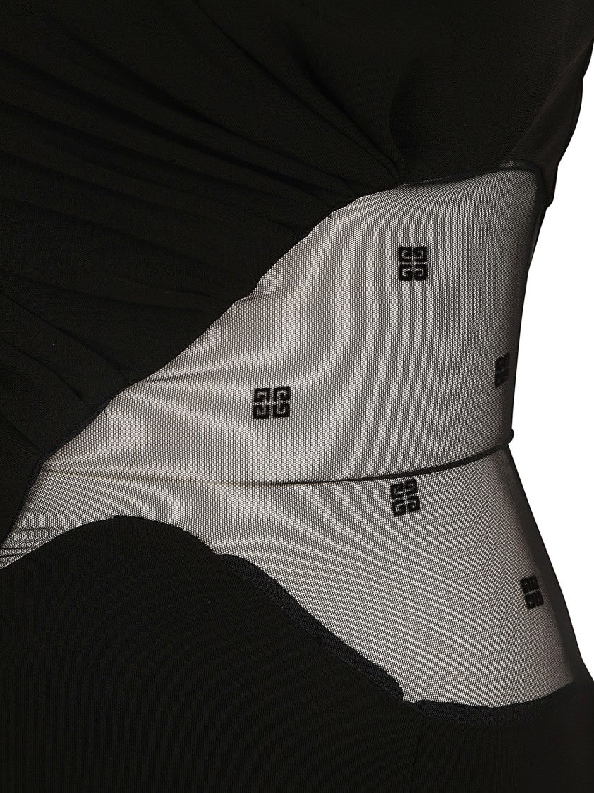 A fitted black dress from Givenchy exudes sophistication and allure. The unique twist detail at the waist is complemented by sheer mesh panels, enhancing its elegance. Cap sleeves and a knee-length cut create a timeless profile, while a subtle slit adds intrigue, making it ideal for refined occasions.