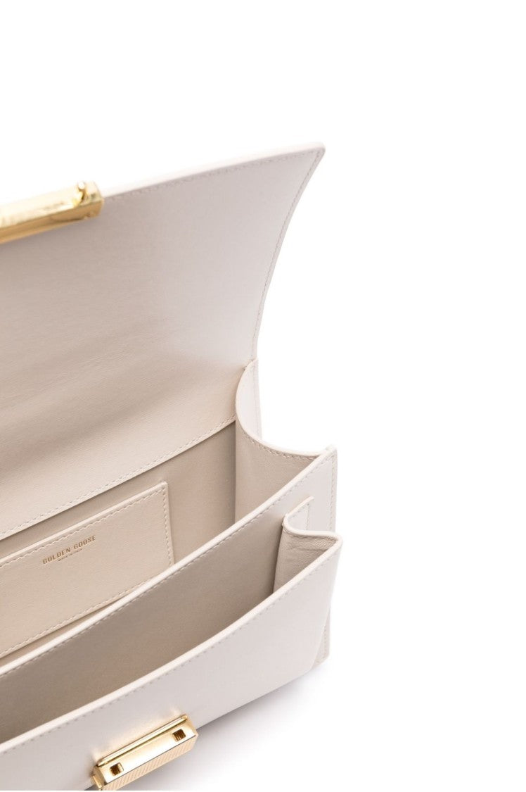 This structured handbag from Golden Goose showcases a refined design, featuring a top handle along with a detachable shoulder strap for versatile wear. The elegant gold-tone clasp on the front flap adds a luxurious touch, while the spacious interior boasts multiple compartments for effortless organization.
