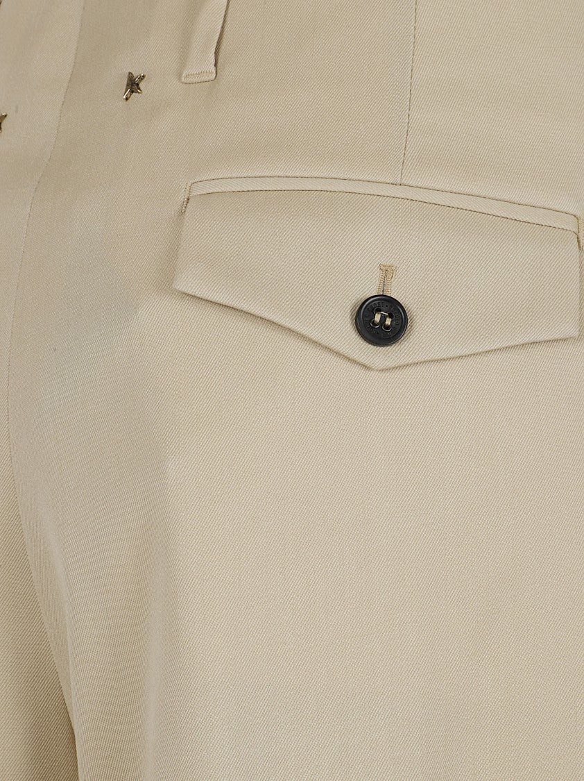 Exuding understated luxury, these wide-leg trousers from Golden Goose embody a refined sense of style. Crafted from 100% viscose, they feature a smooth sand beige finish that complements the sophisticated design elements, including a high waist and box-pleat detail. The trousers are accentuated by pressed creases, two rear flap pockets secured with buttons, and belt loops. The subtle star stud embellishments add a unique touch, ensuring these trousers stand out in any elegant ensemble.