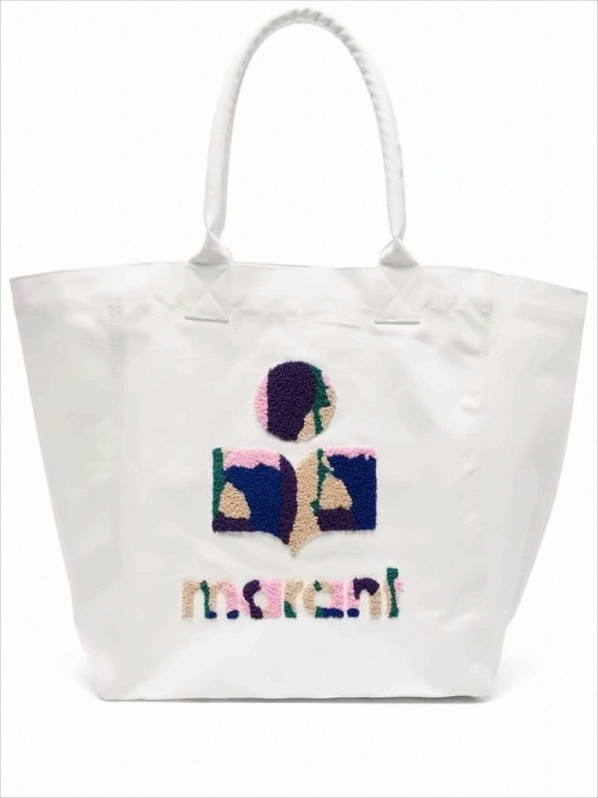 Isabel Marant offers a spacious shoulder bag that combines casual chic with artistic flair. Made from soft, off-white fabric, it features a wide rectangular shape and two sturdy handles. The front showcases a vibrant, textured embroidered logo in an array of colors—purple, pink, green, beige, and blue—adding a playful yet refined touch. The unlined interior emphasizes a minimalist aesthetic while providing ample space for everyday essentials.