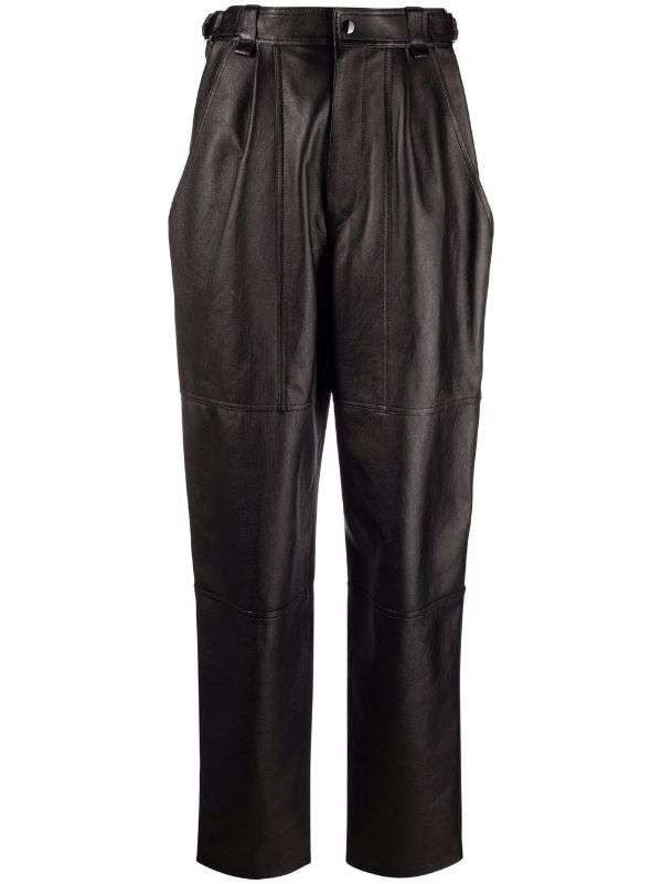 These trousers showcase a straight leg silhouette, crafted from smooth lambskin leather. Enhanced by a high waist with a decorative buckle, the design includes a concealed fly with button fastening and practical front pouch pockets. Subtle seam detailing contributes to their chic structure, embodying a timeless appeal.