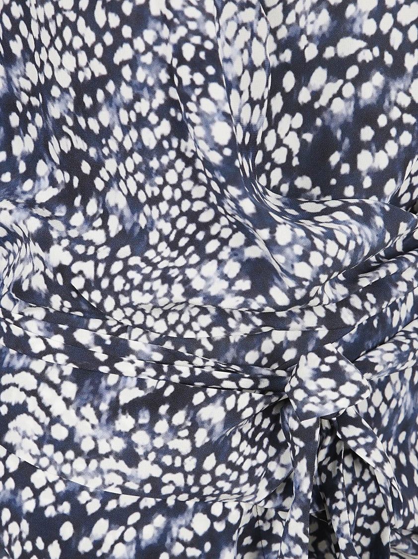 Isabel Marant offers a stunning wrap dress that combines casual charm with sophisticated flair. The flattering silhouette, enhanced by a waist tie, beautifully highlights the figure. Long sleeves and a round neckline add elegance, while a playful print of varying dots in shades of blue and white provides captivating visual appeal, making it ideal for chic outings and relaxed gatherings.