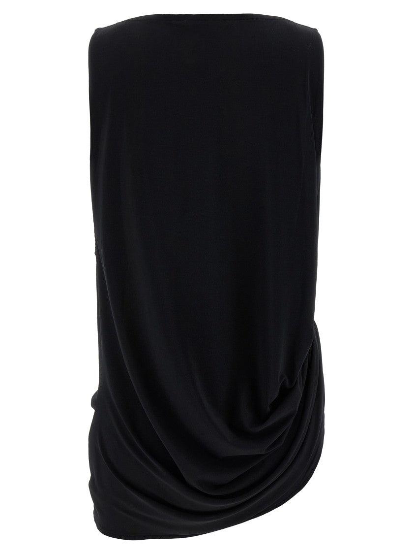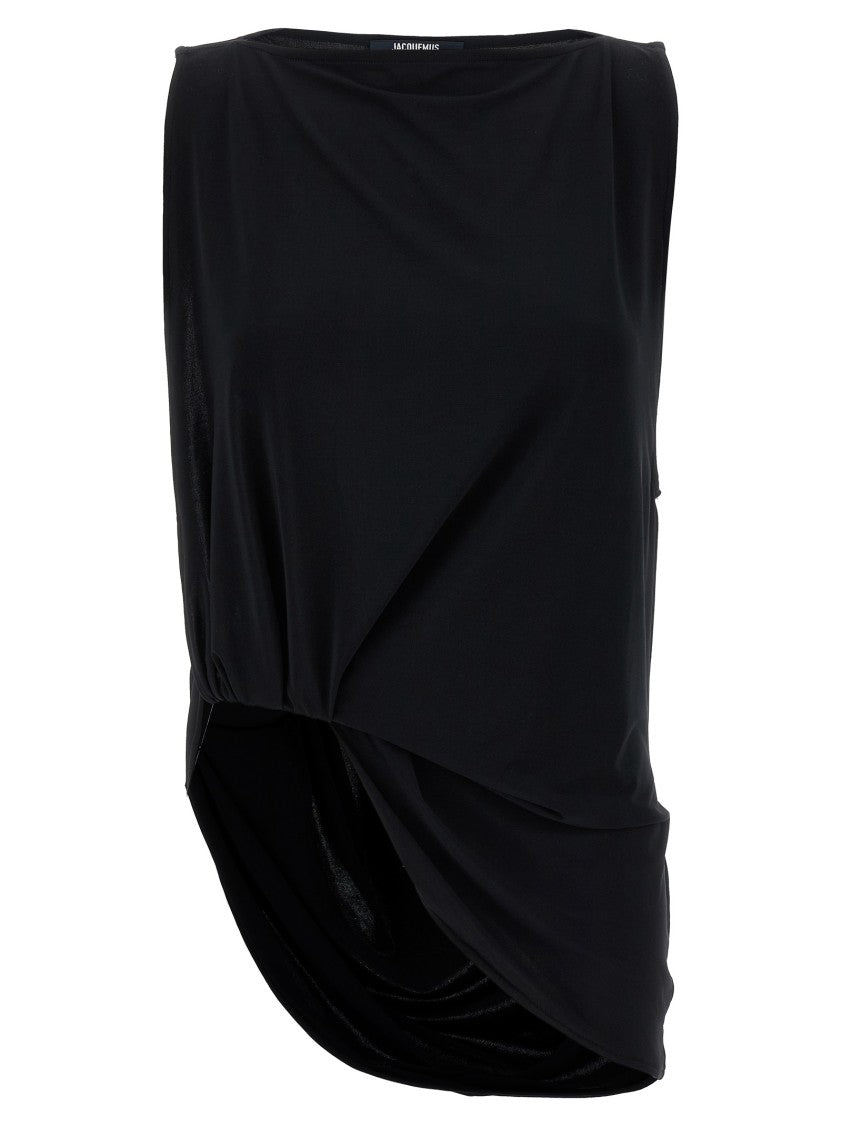 Jacquemus introduces the 'Le Haut Peplo,' a fluid jersey top that reflects modern elegance. It features a square neckline and an asymmetrical hem, complemented by an elastic waistband and woven draping. The design includes a wide sleeve turn on the left and peplums on the right, creating a captivating silhouette suitable for both casual and formal settings.