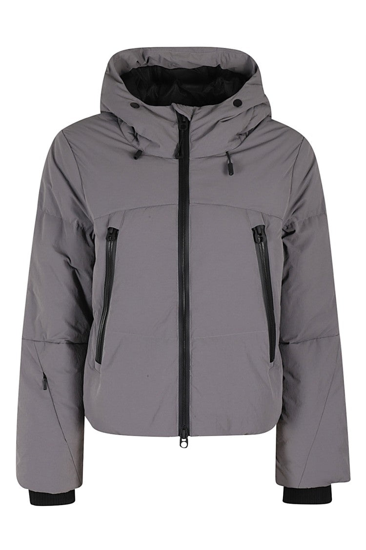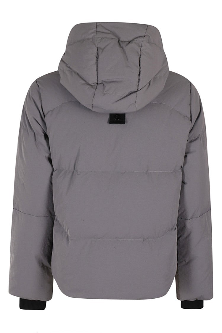 This down coat, created by JG1, embodies modern sophistication with its sleek grey design made from 100% water-repellent nylon. It offers plush down padding for warmth and includes an adjustable drawstring hood, rib knit inner cuffs, and an elasticized hem for a tailored fit. The coat features maxi side welt pockets for secure storage and a front zipper for easy fastening, combining style with practicality.