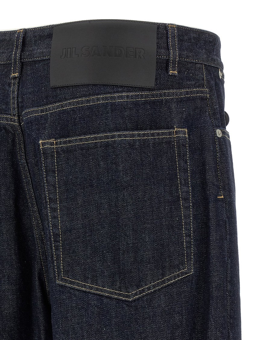 Jil Sander offers heavy diagonal cotton denim jeans that reflect a relaxed vibe, featuring a slightly low crotch and wide leg design. The dark, sturdy denim is accented by contrast stitching, while five functional pockets and a signature leather logo label add a touch of elegance to practicality.