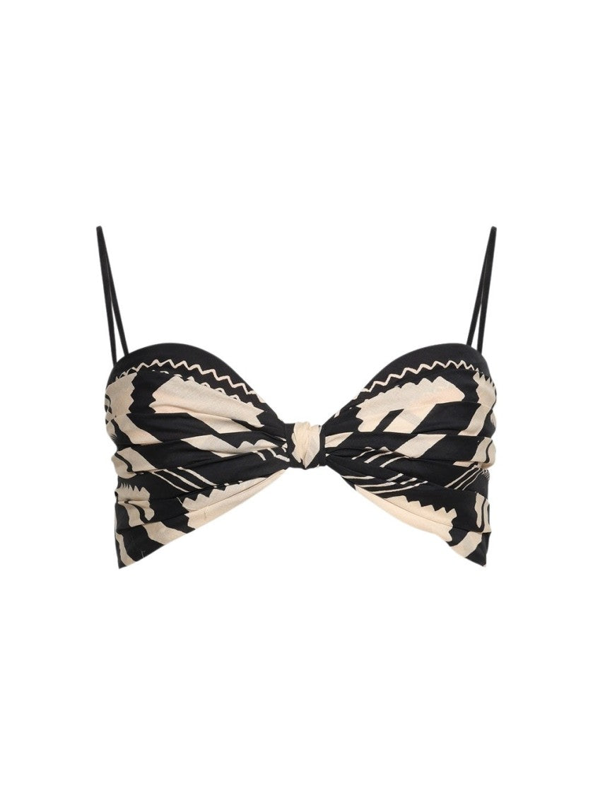 Johanna Ortiz presents this captivating cropped top, expertly crafted from 100% soft cotton for unmatched comfort. The striking geometric pattern adds a vibrant visual appeal, while adjustable spaghetti straps ensure the perfect fit. Knot detailing at the front enhances its unique style, making it the ideal choice for beach or casual outings. A go-to piece for those who appreciate bohemian flair and effortless chic.