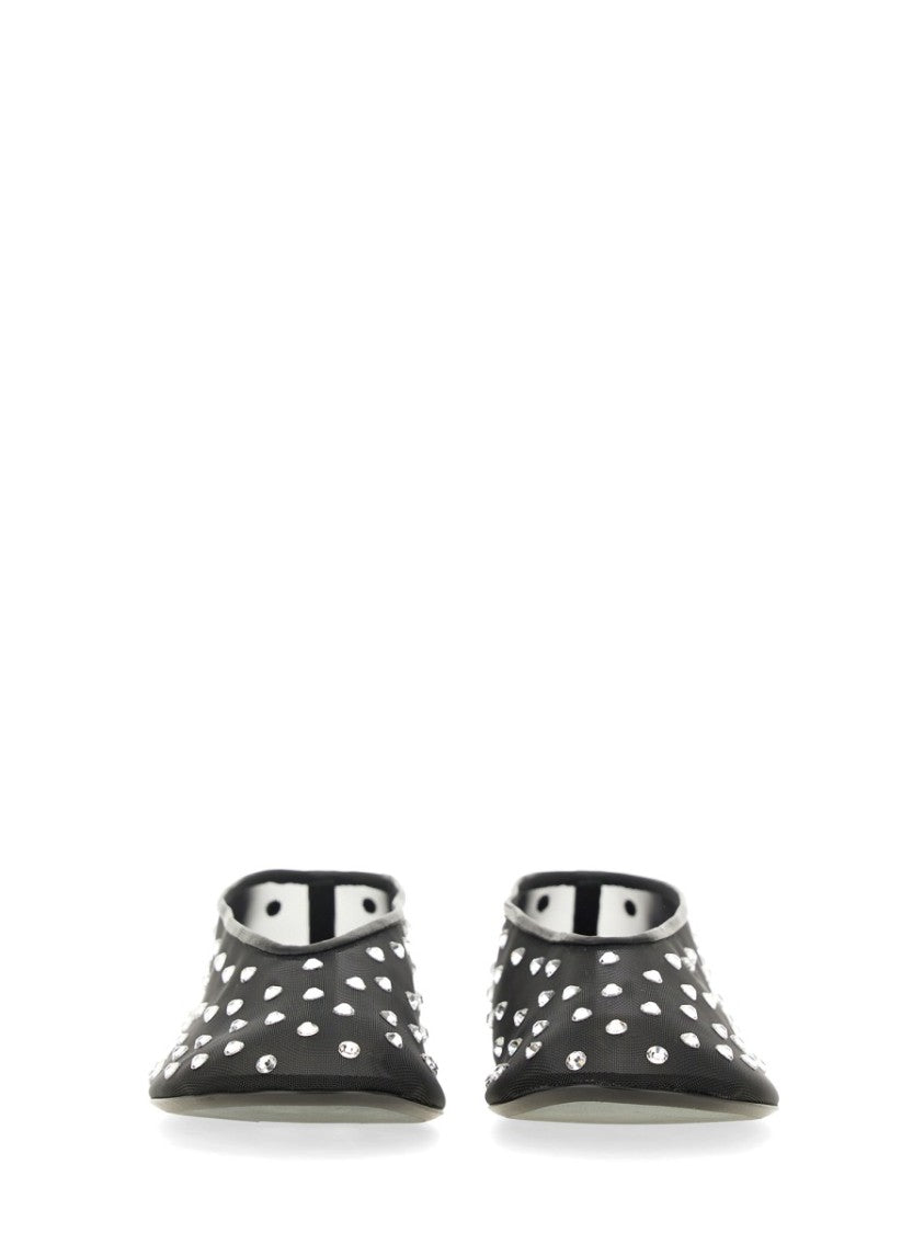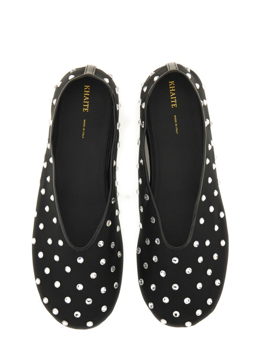 The Khaite 'Marcy' ballerina flats combine playful polka dots with a sophisticated design. Crafted from 100% Italian polyamide, these luxurious shoes feature a pointed toe and charming embellishments for a whimsical touch. Their lightweight and comfortable nature, along with a minimalist aesthetic, makes them versatile for both elegant and casual occasions.