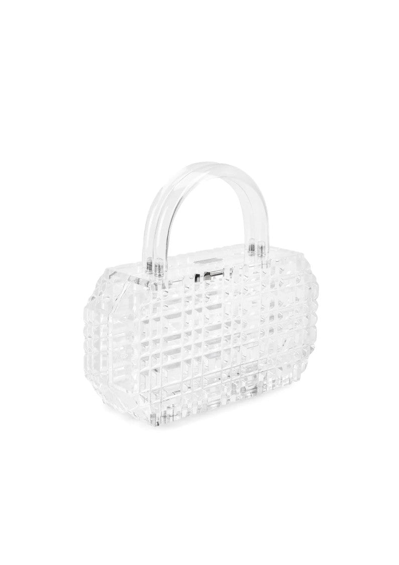 Lafshar’s handmade handbag showcases a stunning geometric silhouette made from premium acrylic with a unique textured surface. This compact yet spacious design features dual clear top handles and a secure magnetic closure, perfect for carrying essentials. Its modern aesthetic complements both day and evening attire, making it a must-have accessory.