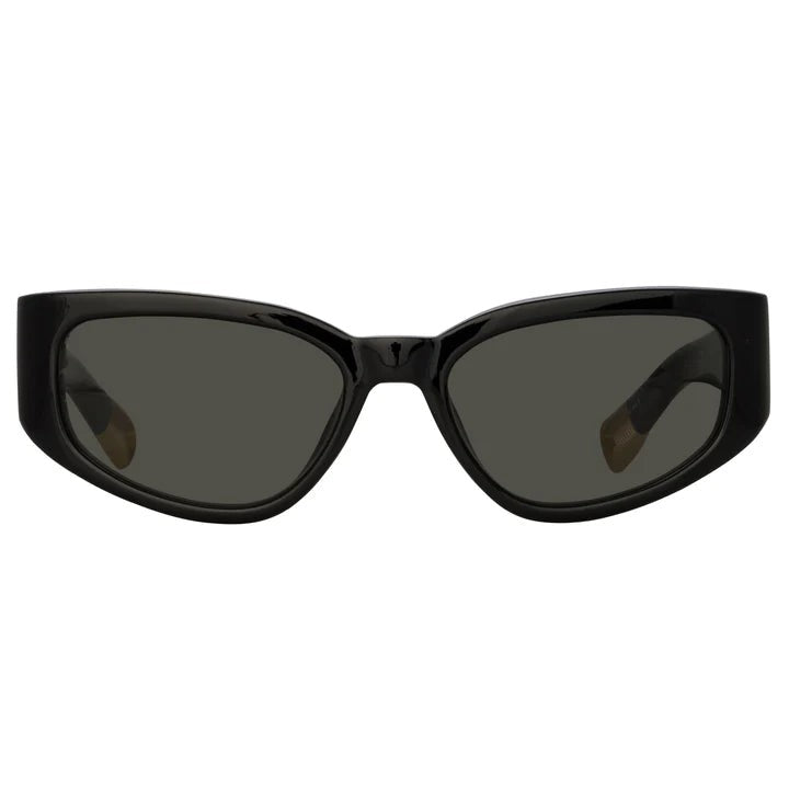 The Gala sunglasses from the esteemed Linda Farrow and Jacquemus collaboration redefine accessory statements. A sleek black frame with striking angular lines enhances the sophisticated black gradient lenses, complemented by opulent gold detailing on the temples. This design encapsulates a luxurious modern aesthetic, making them essential for any fashion-forward ensemble.