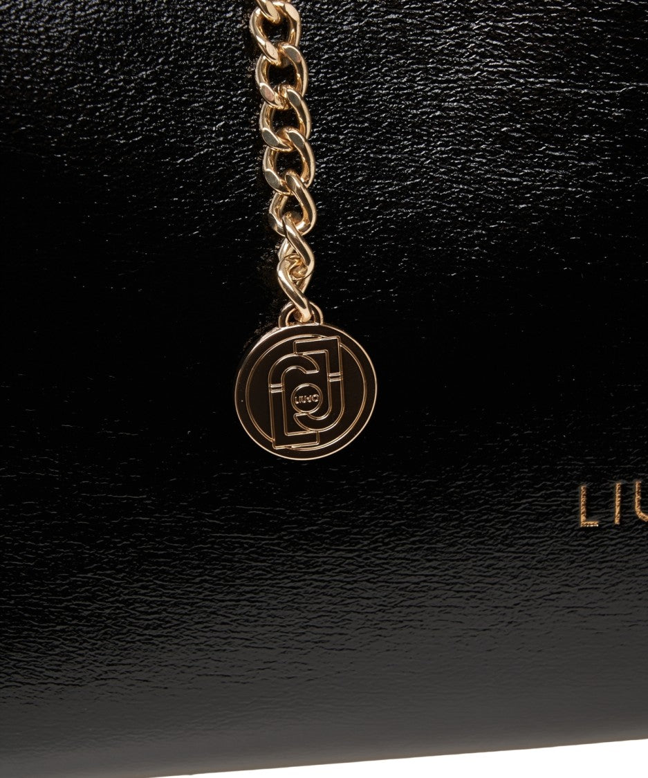 The Shopper 'Doba' by LIU JO embodies sophistication with its sleek rectangular design and glossy faux leather. A secure top closure, two sturdy handles, and a detachable shoulder strap enhance its functionality. Luxurious gold-tone metal accents, including a chain charm and logo detail, add a touch of elegance. This spacious tote is ideal for everyday use and special occasions, combining practicality with style.